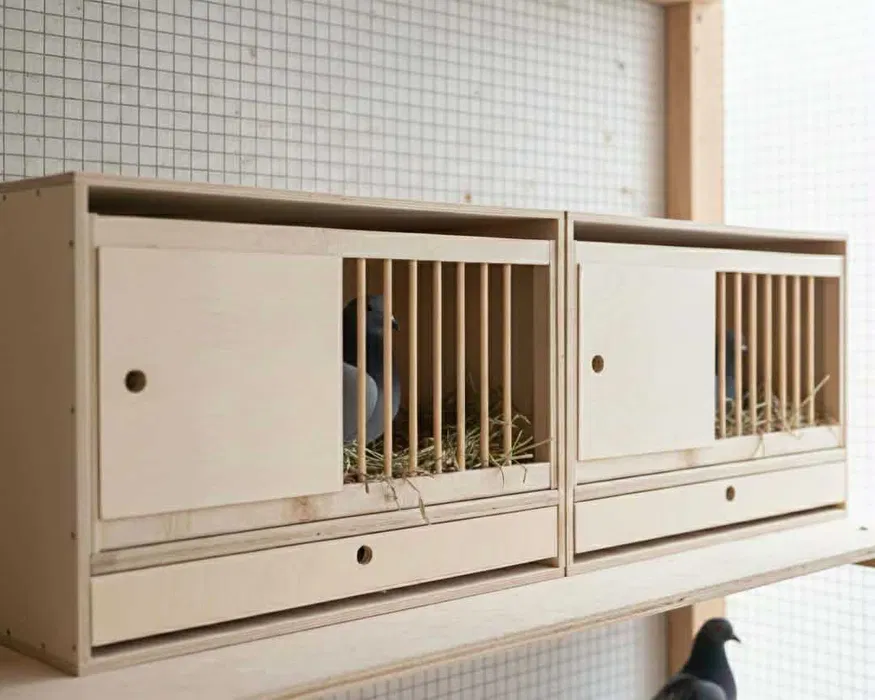 Kompletna cela lęgowa dla gołębi, wykonana z wytrzymałej sklejki brzozowej wodoodpornej, przeznaczona do profesjonalnych gołębników i hodowli. Konstrukcja zapewnia komfortowe warunki lęgowe oraz wygodę codziennego użytkowania.